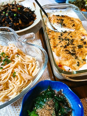 ポテトグラタン・明太子のパスタサラダ・ひじきの煮物・ほうれん草のおひたし