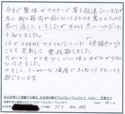 今まで整体やマッサージ等を敬遠していましたが、冬に脚の筋肉が固くなってきたのを寒さのためと思って過ごしていましたが、それは思い込みだったと知りました。 何かの時にとファイルしていた「快福クラブ」のことを思い出して電話致しました。 それから4ヶ月少しづつ体のゆがみが少なくなってきました。 やさしく、丁寧な治療でよくなってきたことを感じています。