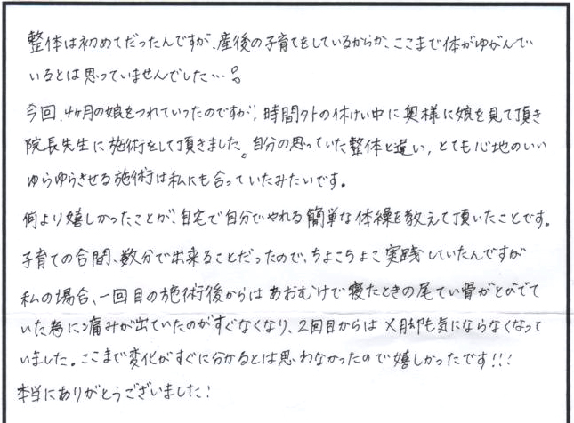 産後の体のゆがみと尾骨の痛み(小倉南区城野在住)体のゆがみ,尾骨痛,産後の不調