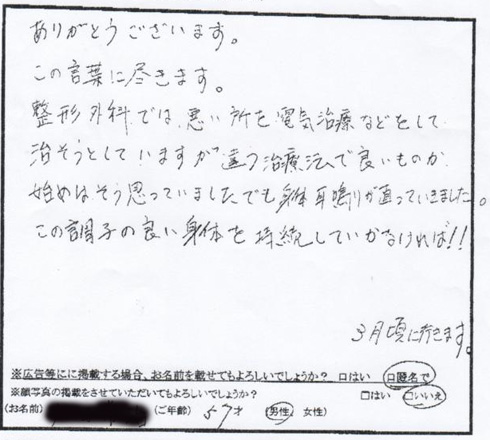 ありがとうございました。この言葉に尽きます。 整形外科では悪い所を電気治療などをして治そうとしていますが、違う治療法で良いものか、初めはそう思っていました。 でも身体耳鳴りが治っていきました。 この調子の良い身体を持続していかなければ!! 3月頃に行きます。
