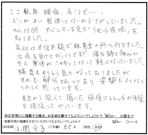身体のゆがみが気になっていた事もあって、以前、何かで林先生の事を聞いていて、ずっと気になっていたのですが、やっと来る事が出来て、ずいぶん身体も柔らなくなってる事も実感でき、喜んでいます。