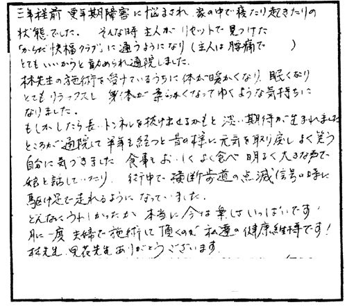 三年程前更年期障害に悩まされ家の中で寝たり起きたりの状態でした。