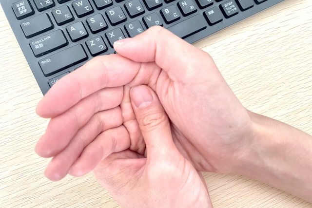 肩や肩甲骨周りの筋肉が硬くなることで神経が圧迫され、手の痺れや握力低下を引き起こすことがあります。デスクワークやスマホの長時間使用による姿勢の悪化が主な原因となることが多いです。
