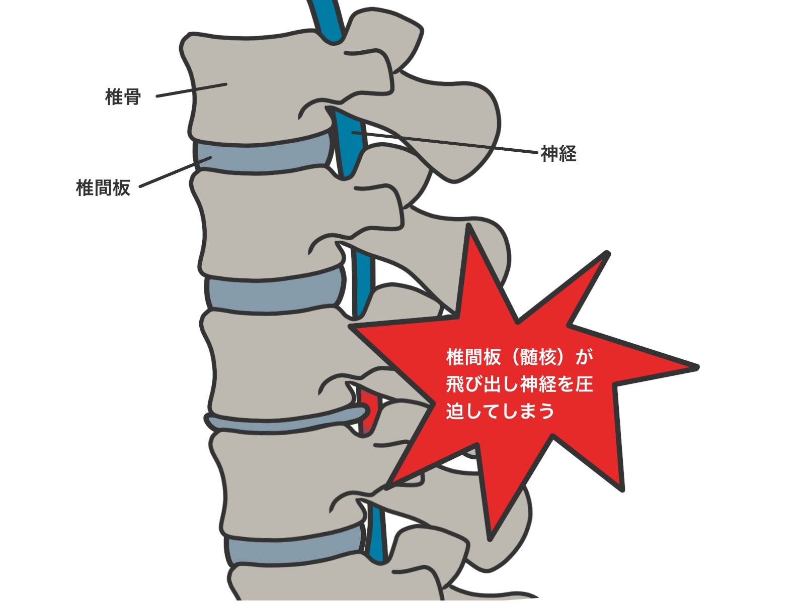 ヘルニアの多くは背骨の動きが悪くなっていることが関係しています。特に上部胸椎や腰椎の硬さを取り除くことで、神経の圧迫を和らげる効果が期待できます。