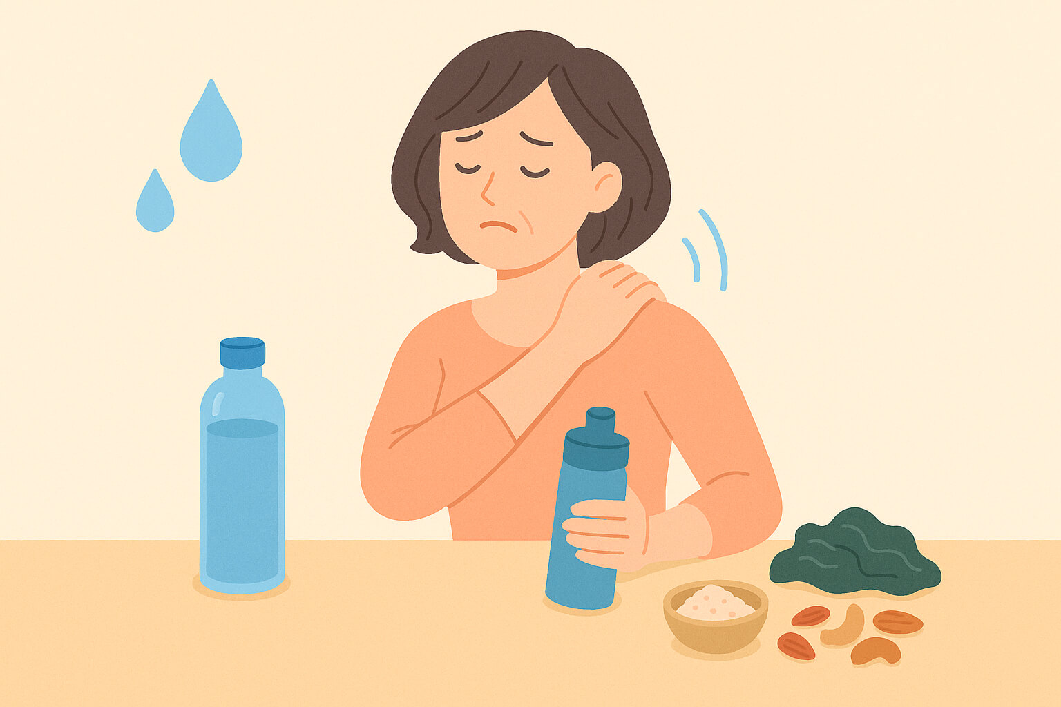 もちろん水やミネラルだけで肩こりがすべて解決するわけではありませんが、「水分不足は筋肉と fascia を乾かし、ミネラル不足は緩むスイッチを壊す」という大切な視点を持っておくことは、毎日のセルフケアを確実に底上げしてくれます。デスクワークの合間、ついコーヒーやお茶だけで済ませがちな方は、同量以上の水を追加するだけでも体は反応します。